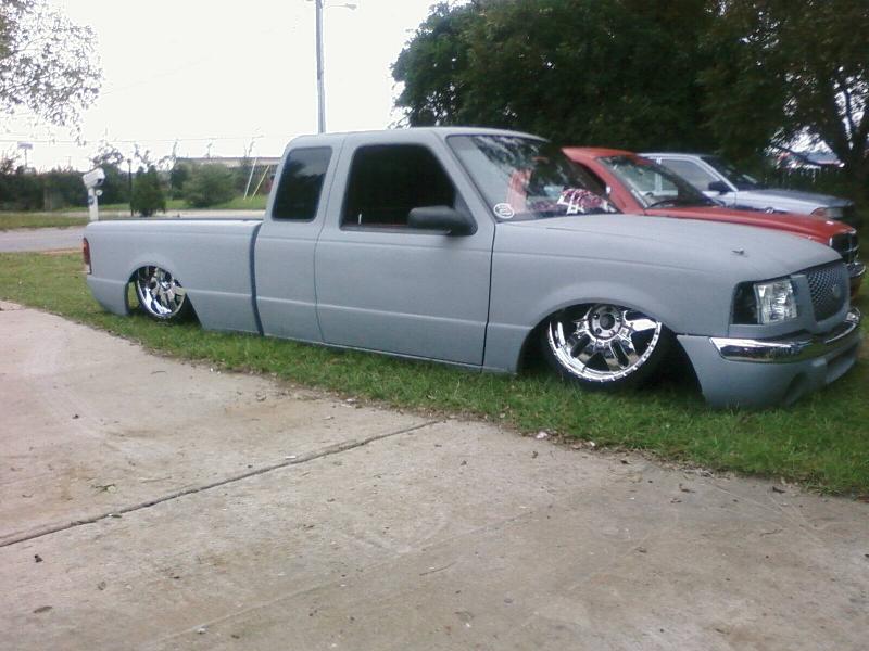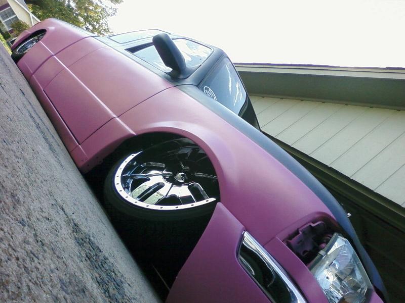 *SOLD* traditionally bodydropped 4.5 inches, 2004 ranger edge front clip, shaved drip rails, cab seams, door handles, antenna, emblems, 3rd brake light, stake pockets, smoothed wiper cowl, candied the tail lights. top - satin black. bottom - satin watermelon pink