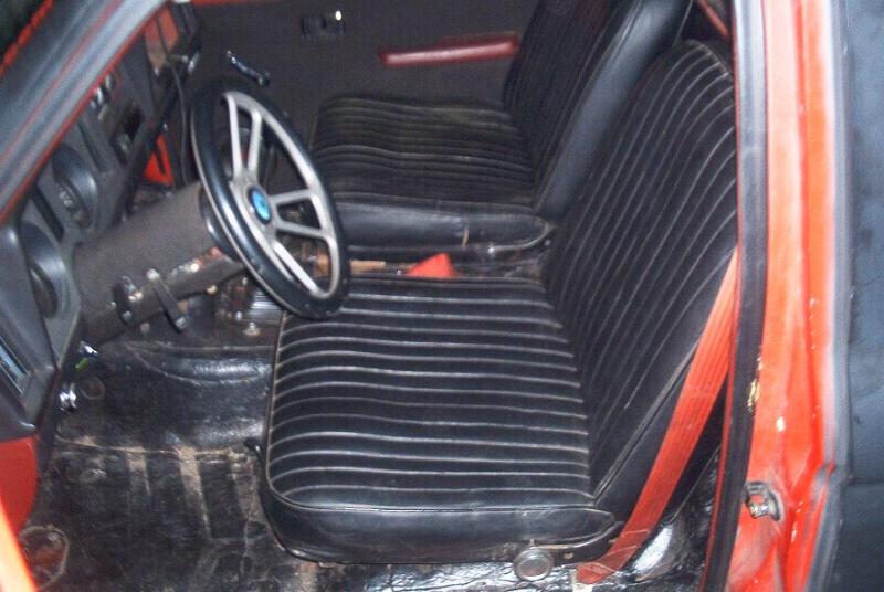 probably black and tan, 60s ford bucket seats coverd in black tuck n roll in 1969, 88 cluster w/ tach,140 mph ford motorsport speedo,ford motorsport(auto meter) oil press and water temp gagues,78 courier shift arm, hurst shift boot