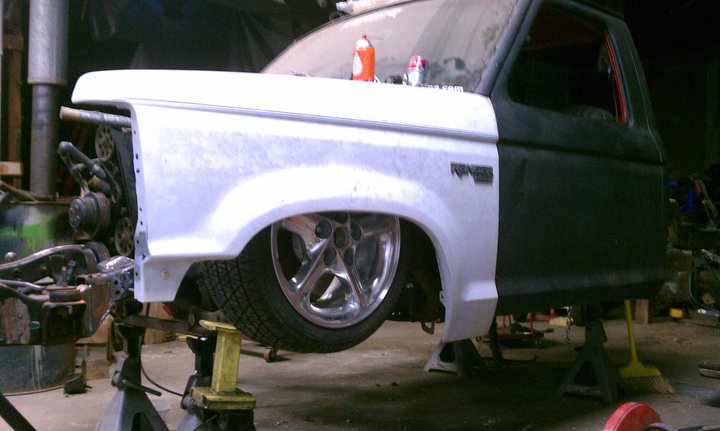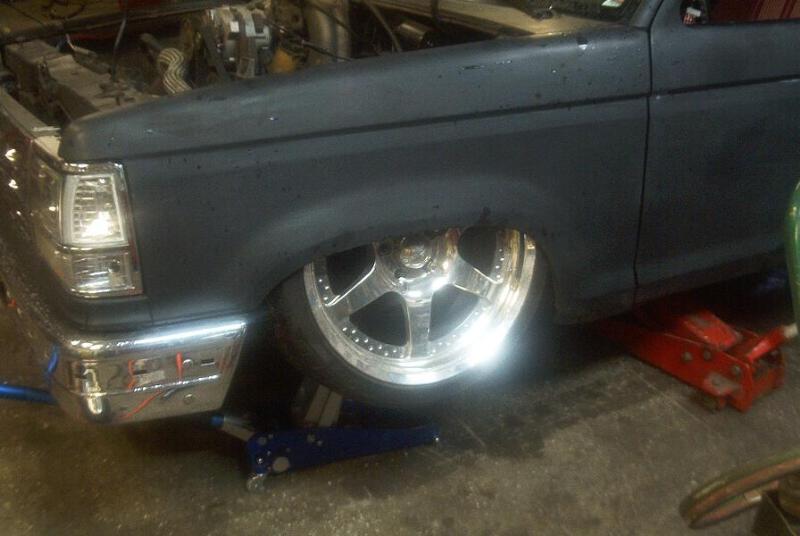 4 in body drop,89-92 front end,diamond clear headlights/corners, old school clear tails,acetoned explorer grill, shaved emblems, stake pocket holes,handles,wiper cowl, paint hopefully this winter,stock hood fits with the motor lowered 3 inches.
