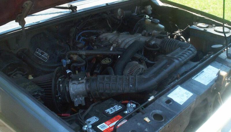 3.0 v6 5spd, k&n filter,auto lite double platinum plugs, 93 tbird maf and 30lb in jectors, ford motorsport 9mm plug wires, 2.25 pipe from y pipe back, hi flow converter, borla exhaust, home made cold air intake,throttle cable mod, deleted a/c compressor