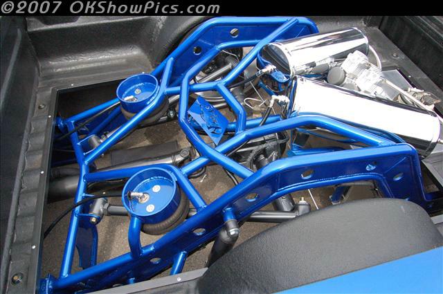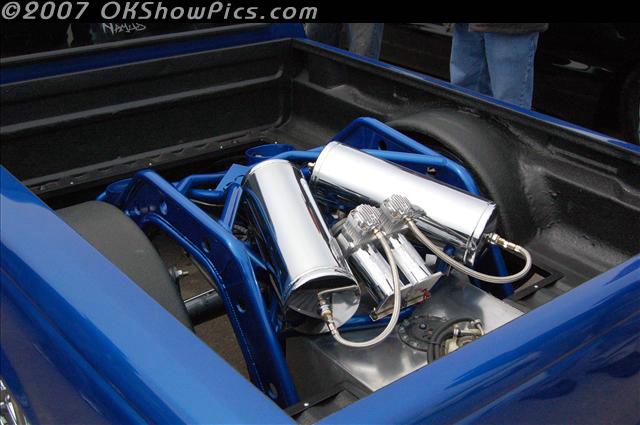 Stock floor body dropped 3", slams on tubular mounts up front,cantilever, full tubular backhalf with tri 4 link,dual viair 380s, 1/2 valves, wheels tubs front and rear.