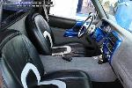 Stock seats cut down and covered in black leather with silver carbon fiber and ostrich inserts, painted and tweeded dash, Billet Specialties Rail steering wheel, billet a/c knobs, black carpet