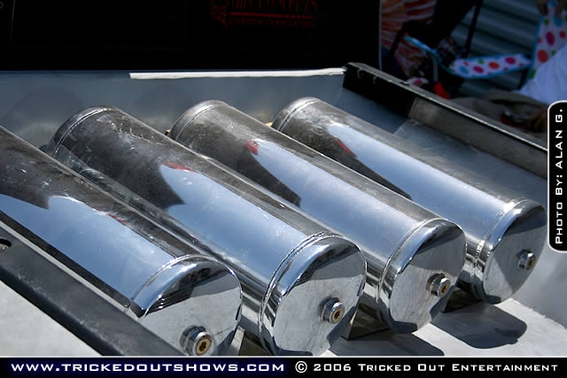 Laid out with Parker 1/2" valves, Slam ES 72's up front with DJM control arms. Slam RS 62's out back with a KP COMPONENTS 6 link. 4 chrome 3gallon tanks filled with 2 Viair 450s, KP Components Digital Ride Height Controller