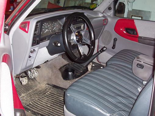 some interior parts covered with gray tweed and maroon painted interior parts to match exterior, billet shift knob and billet pedal covers, billet Grant steering wheel & adapter.