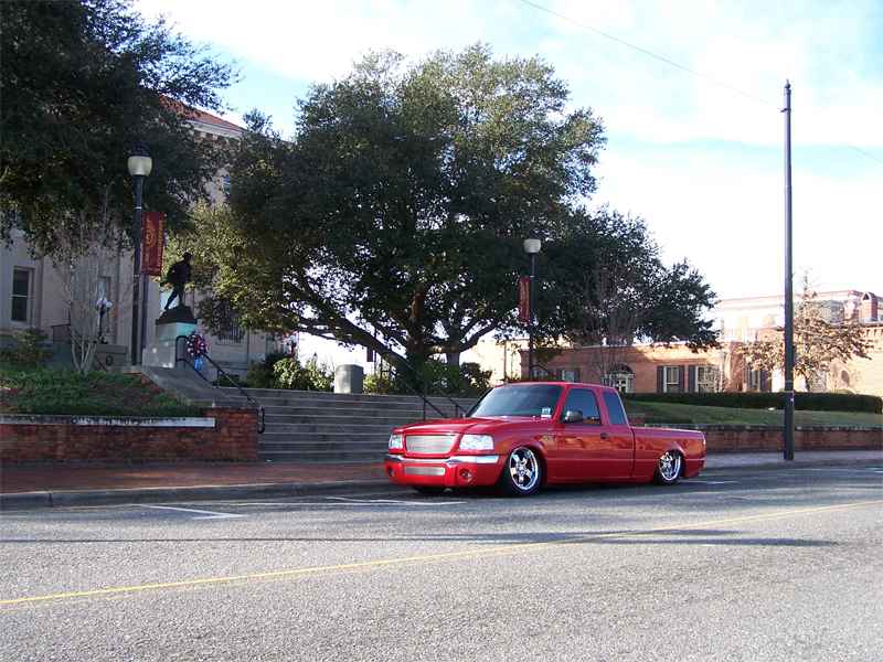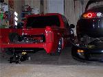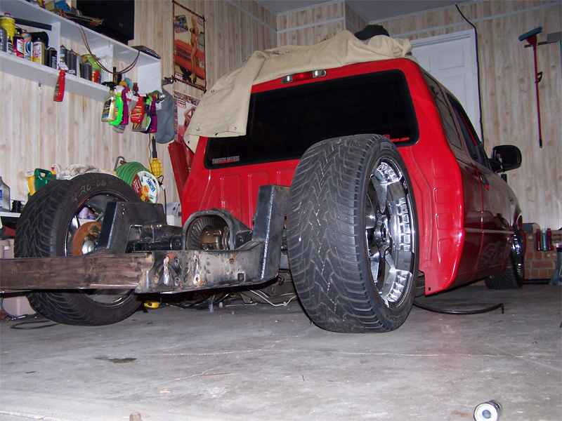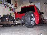 Slam RE-6's & RE-7's , djm arms, tri 4-link w/ bags on upper bars, 5" narrowed rear w/ mustang disc brakes, chrome Carrera/QA1 cantilevered rear shocks w/heims, GC 250 valves (1/2 fill, 3/8 dump), 1/2 line, color matched 8 gal tank, york 210 EDC