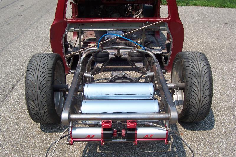 mII front suspension/full frame,totally from scratch ( bought ball joints, rings , 2" drop spindles, brake kit and steering rack and built everything else. ) went from 4 1/4" traditional bodydrop to 1 1/4" traditional w/ about 4" of stockfloor slam re6 in front , currently es72 in back. 2 five gallon chrome tanks, 2 AZ compressors. everything done in the KINGSIZE garage....