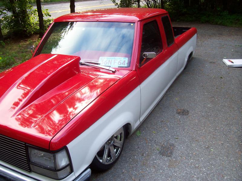 custom mix two tone paint , top red from chrysler and bottom custom tinted white base,shaved doors, emblems,squirters,third brake light,antenna,gas filler door, welded tailgate shut, stake pockets