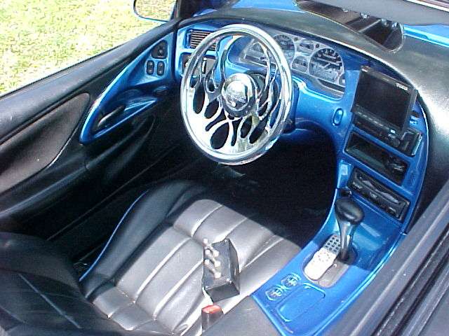 its got black leather removed the front head rest when interior got redone to change it some also blue trim around the black leather seats painted dash ,glassed console,doorsand rear deck , rear panels anre same color as the car flamed gauges with a godfather customs fire steering wheel and trenz billet 3d flamed rear view mirror ,fiberglassed back half of inner rear panels ,console and pillars