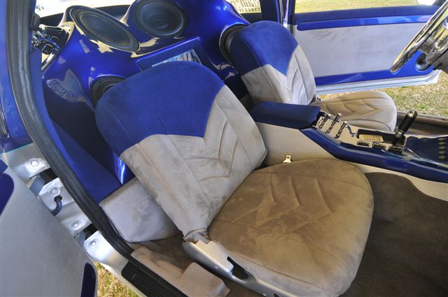 Fully custom blue tweed interior including door panels, window pillars, kick panels, kick plates, custom rear panels, package tray, and headliner
