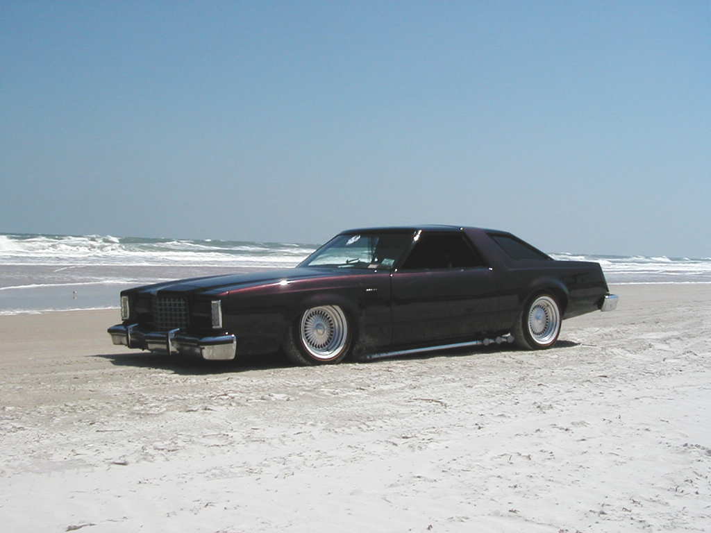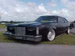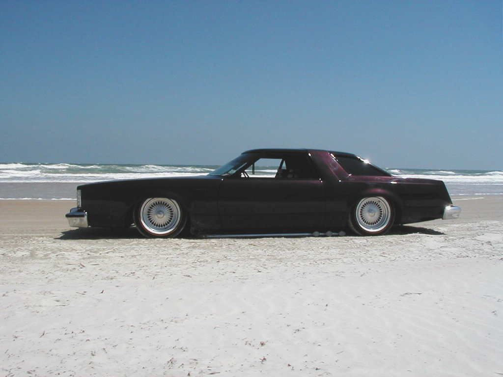 Shaved: Door handles, locks, mirrors, Opera windows, Landau bars, side body moldings, front and rear side markers, antenna, and gas door. Mods: Continued and faded body line up the Landau band, relocated gas filler, and hinged rear body filler panel for gas filler. Extras: De-chromed all window moldings, paint match tinted tail light lens, swapped bumpers with moldings from a 78 Cougar, added chrome Triple Lake side pipes currently for show. Paint: PPG Black with HOK Gold Prismatic Flake & PPG Translucent Red Pearl patterned overlay.