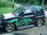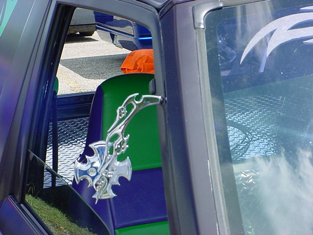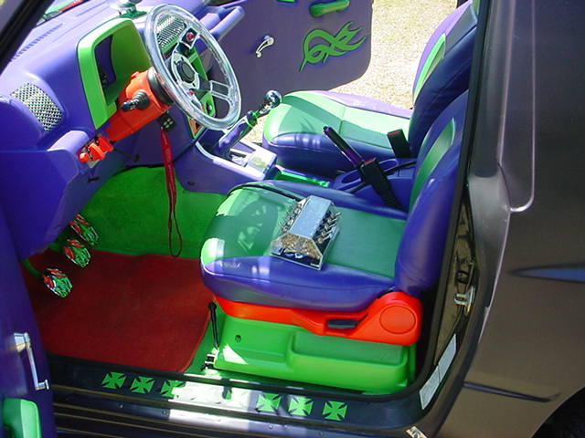 *FOR SALE-$5000.* dash dyed purple w/ neon green and florescent orange trim, florescent green carpet with florescent orange floormats, purple and neon green vinyl interior w/3-d tribal graphics, custom stainless steel dash trim, purple and green neons and LEDs, color-shifting tach. Acrylic and chrome color shifting steering wheel.