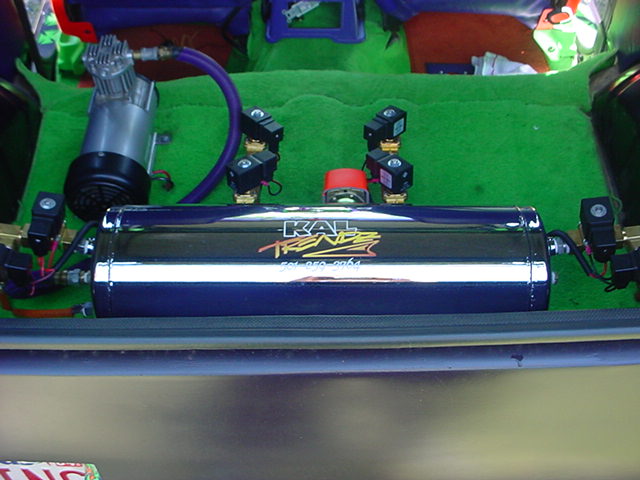 *FOR SALE-$5000.* Has F/B/S/S. Bagged w/ Firestone 2600 bags on each corner, fast valves, 1/2" orange airline throughout, 6 gal. chrome tank. Frame and suspension painted purple, orange, and neon green.