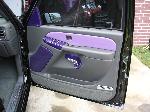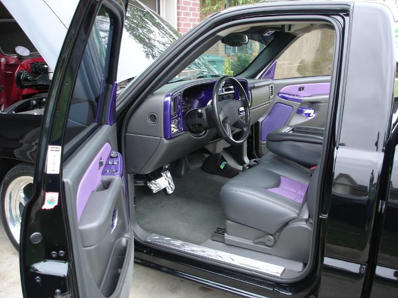 ///Billet dash pieces, billet shifter, billet flame pedals, billet flame door sill plates, billet ac and headlight knobs, billet door lights, billet trim for ac vents, interior escalade handles, dash and door pieces painted purple, Classic Soft Trim purple and gray leather, painted dash and a B.A.D. steering wheel