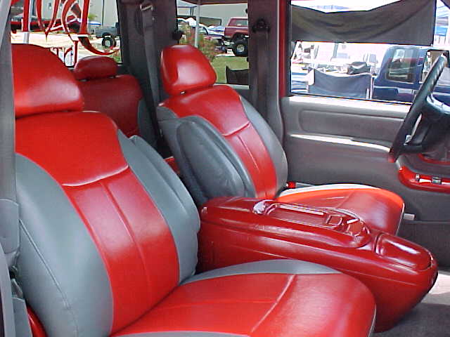 Custom red and gray leather interior. Smoothed and painted parts inside including center console. Billet Rearview mirror, pedals, and gauge piece.