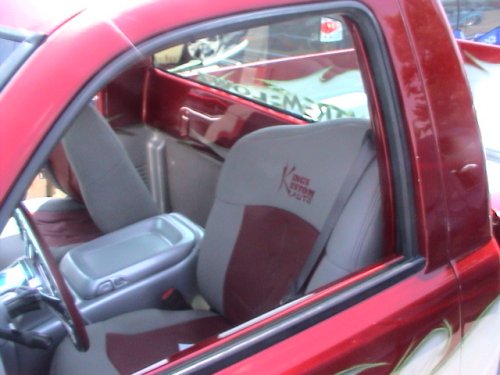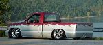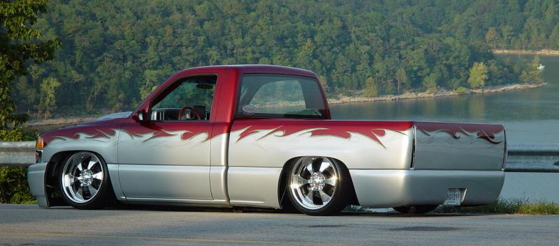shaved: stake holes, handles, tailgate, roll pan, cab seams, full sheet metal inner bed w/ relocated gas door, 96 caddy lights, 02 denali front clip, smooth wiper cowl, painted Kandy Brandywine, Ford Frost silver, and Green apple (paint and bodywork by Tim Armstrong of Kreative Kustoms in Ashland City, TN)