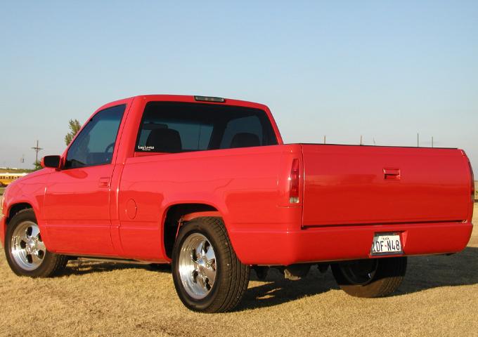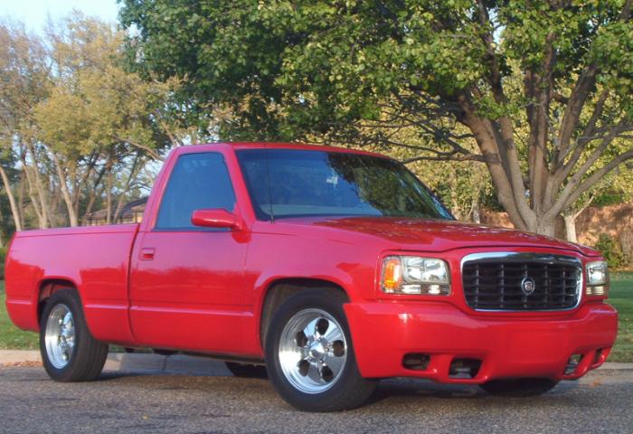 Escalade Front Clip,shaved stake pockets, welded Sir Mikey's roll pan, Slim Top Tonnae, Street Sceen mirrors, smoothed and painted door handles.SOLD