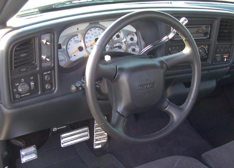 Empire billet aluminum bezel over white face guages, custom aluminum plate to hold white face dual needle air guages, and switches for the bags on the dash. Trenz shift handle and pedals. Sold the Custom speaker enclosure that housed amp and 2 12's