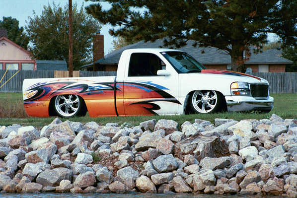 shaved hadles,3rd brake, tail lights, caddy lights, shaved front bed, back of the cad and fire wall, paint and body by Todd Boatrite, graphics by Chrales "The KID" Armstrong