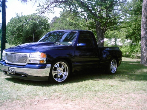 Goodmark cowl hood, speed grill, Tahoe painted door handles, billet antennae, Denali projectors, swapped for a fleetside bed, shaved tailgate and smooth rollpan