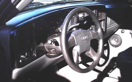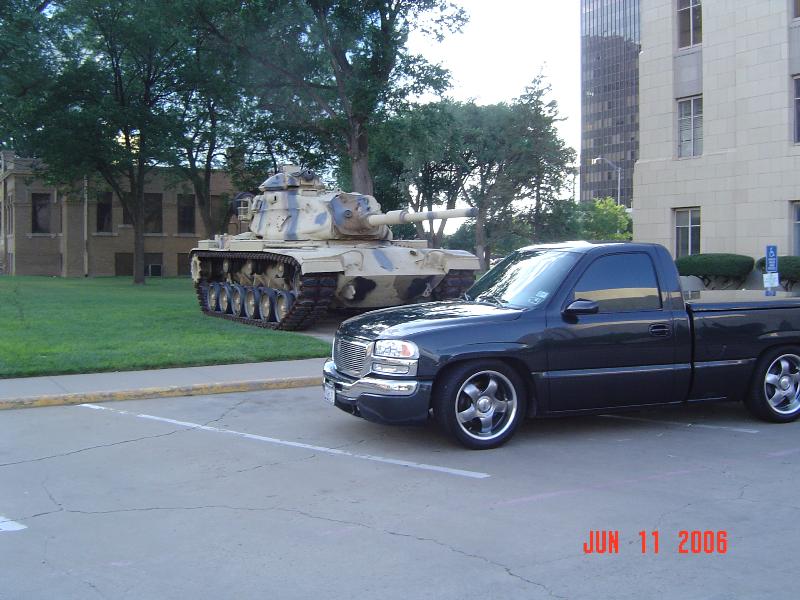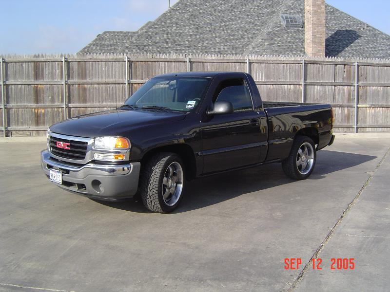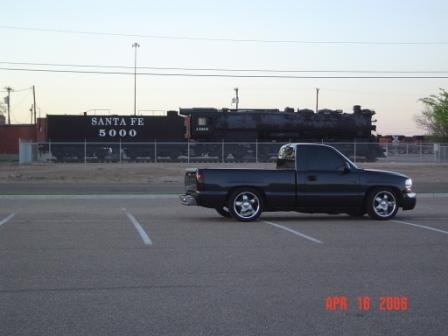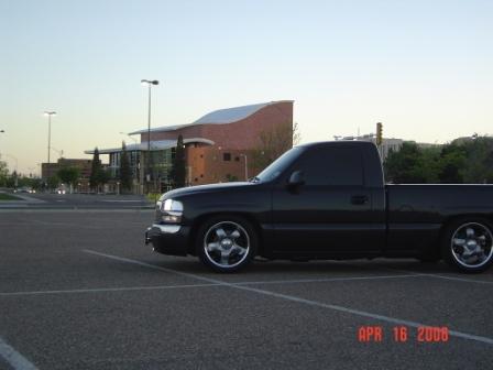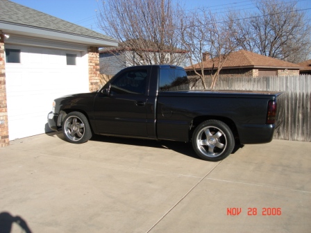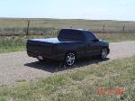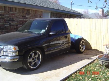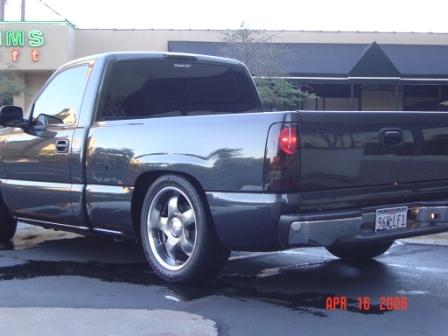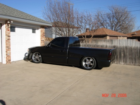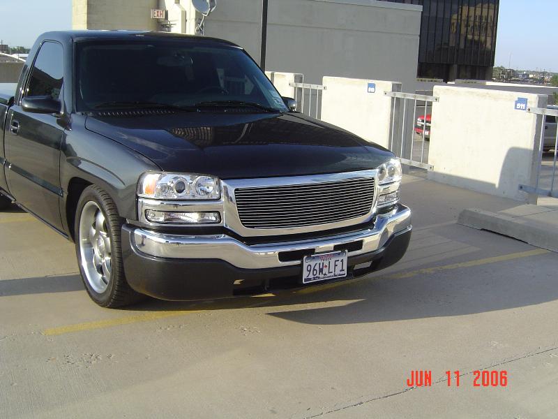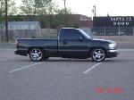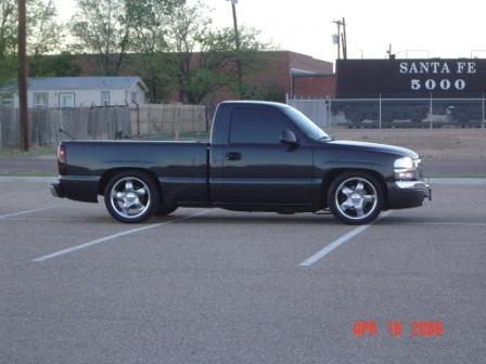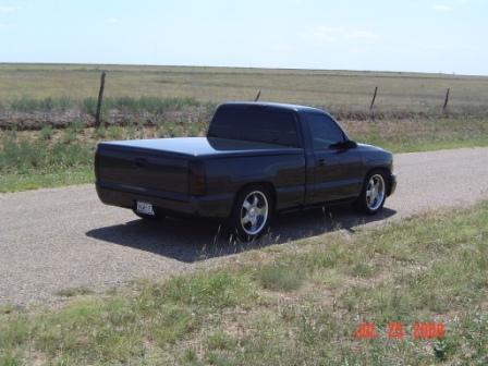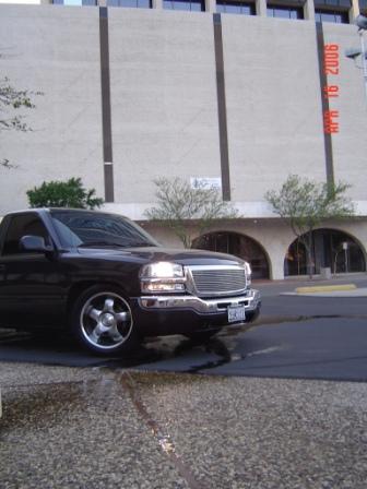 Dark Spiral Gray Metalic paint, Removed moldings and emblems, 8% tint on the windows, Smoked tail lights, Carriage Works billet grill, custom fiberglass front bumper, color match street scene mirrors, denali back door handles (NO key holes), color match snug lid, TYC denali style projector head lights, TYC clear parking light, Sir Michaels steal roll pan, shaved tail gate,60 inch.L.E.D. (Body work done by Larry at KUSTOM BIKES).