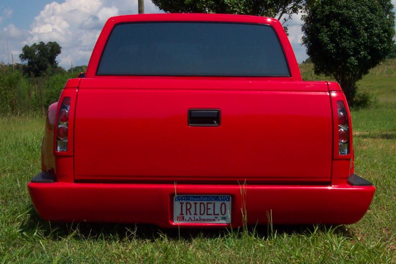 Viper red with blue pearl ghost flames, molded roll pan, all emblems and trim have been removed