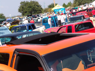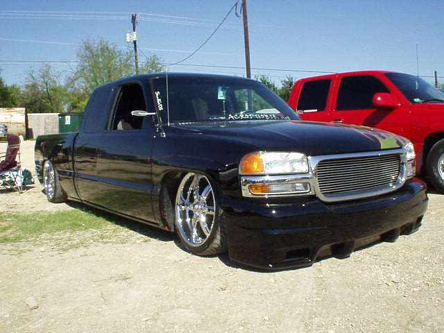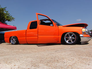 House of Kolor Tangelo pearl shaved door handles and taillights, third brake light, stake pocket holes, amd rain gutters, moldings, emblems, and gas door, shaved license plate brackets, beefy billet grill, Denali Headlights, molded in tailgate skin and roll-pan, shaved and relocated mirrors, billet tailights and mirrors, 40"x40" sliding ragtop, billet wipers