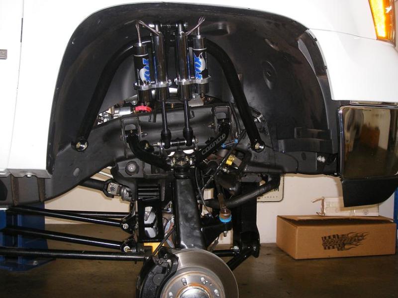 All work done by StreetShock in valencia CA.cognito 12in w/ upper arm and dual shock kit. Pitman & idler arm bracket kit. Deavers in the rear. Chrome fox's w/ reservoirs.
