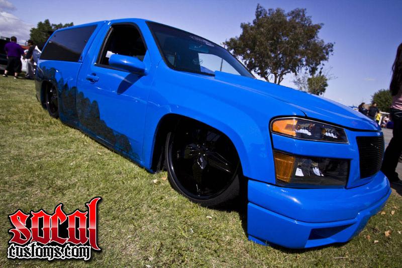 Bagged all the way around on slam ss bags. 6s in the front and 7s in the rear. Has a 3 link rear with a wishbone setup. Bags over the narrowed axle. Front has custom upper arms with modified lowers. Trucks bodied 3.5 inches