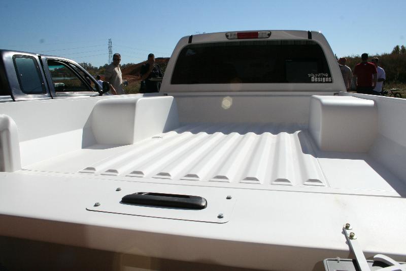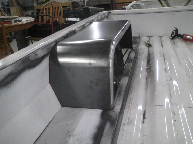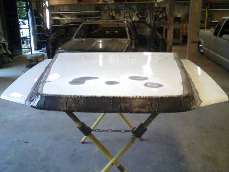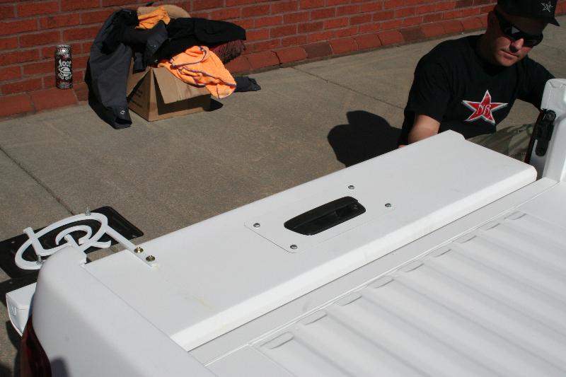 "Half-Gate" half skinned fully functioning tailgate that meets the raised bed floor. Shaved gas filler door, custom pop-up gas door from Hot Match. Completely custom hand-built hood.