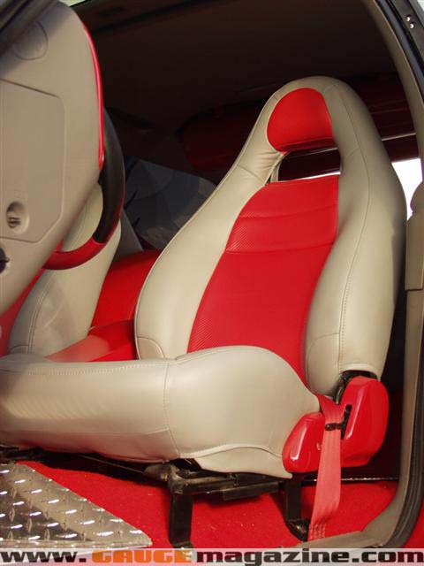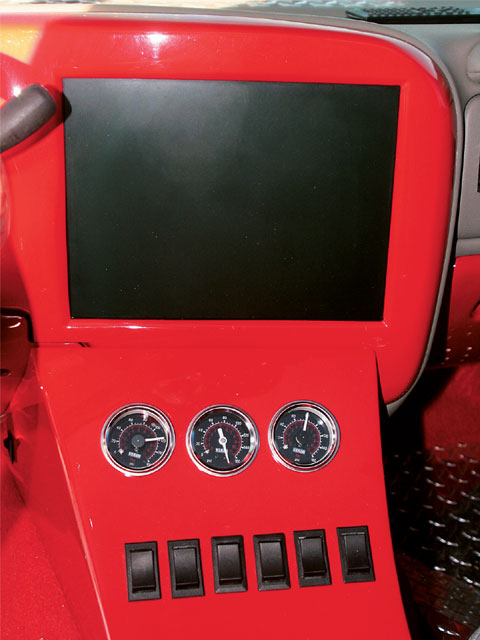 smoothed and painted misc. pieces; sheetmetal console holding air gauges and switches; pioneer headunit moved to headliner; memphis speakers and amps; mx3 seats reupholstered, along with rear jeep wrangler seat; 12" moniter molded into the dash.
