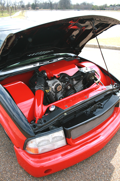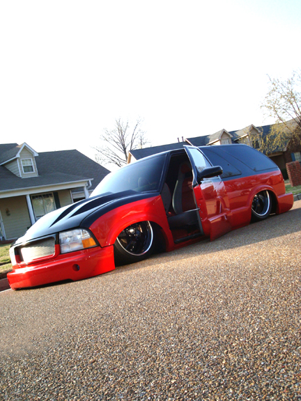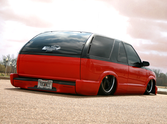 3" stock floor and 3" traditional = 6" body drop, doors sit about 1/4" from the ground; custom built hood; 98+ body style bumper with 2" added to the middle; raised hood and fenders 1.5" to clear the wheels; shaved: hood squirters, antenna, door handles, roof rack, 3rd brake light, gas door [relocated to the roof], tail lights, tag lights, rear wiper, passenger wiper; LEDs in rear bumper; painted Dupont Viper red and Kalapana black; suicide doors.