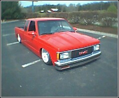 all the usual stuff shaved, Chevy Victory Red paint, updated GMC grill,goodmark cowl hood, 3 1/2 in. bodydrop on cab, 6 in. on the bed to keep stock floor in bed