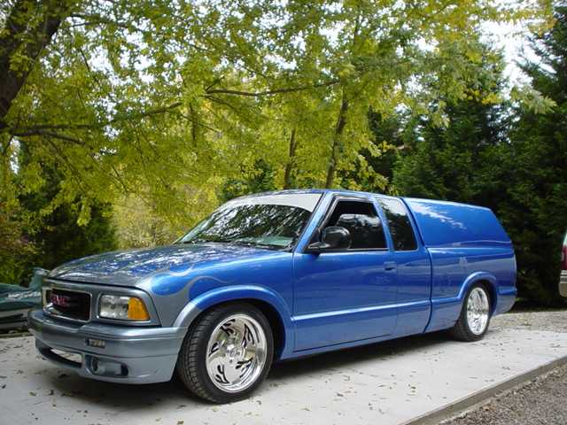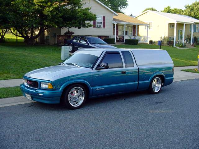 All work done by me, 4" belltech drop all the way around,17+8 boyd diablos ,ripped out exhaust from cab back rerouted coming out in front of back right tire,CHERRY BOMB glasspack muffler, steel GM factory rollpan, shaved tailgate handle, ripped out all intake hoses,most of engine compartment painted bright blue,silver brow,rain guards on windows,short billet antenna,windows tinted 20% up front 5% on back,shaved off all emblems,leer cap,wipers painted silver matching truck, cowl screen painted silver, (not shown in pics) green fog lights,all under truck blacked out