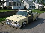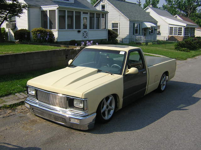 Toyota front bumper conversion w/billet insert/ 91-93 Grille conversion w/billet insert/ H4 headlights, 3" fiberglass hood, Shaved cowl, Body line shaved on fenders and tailgate and bed, shaved antenna, shaved emblems, shaved tailgate handle, license plate box molded in tailgate, frenched smoothie roll pan, street scene mirrors, yellow and gray primer...
