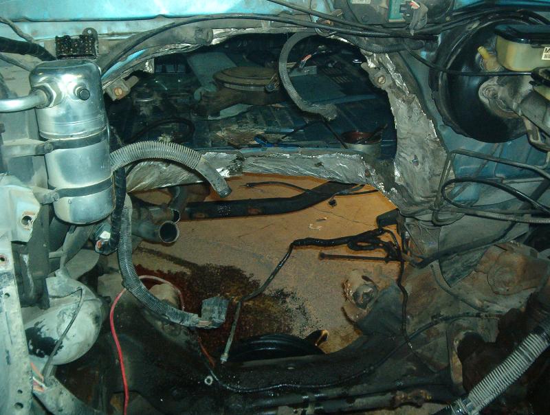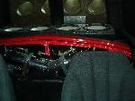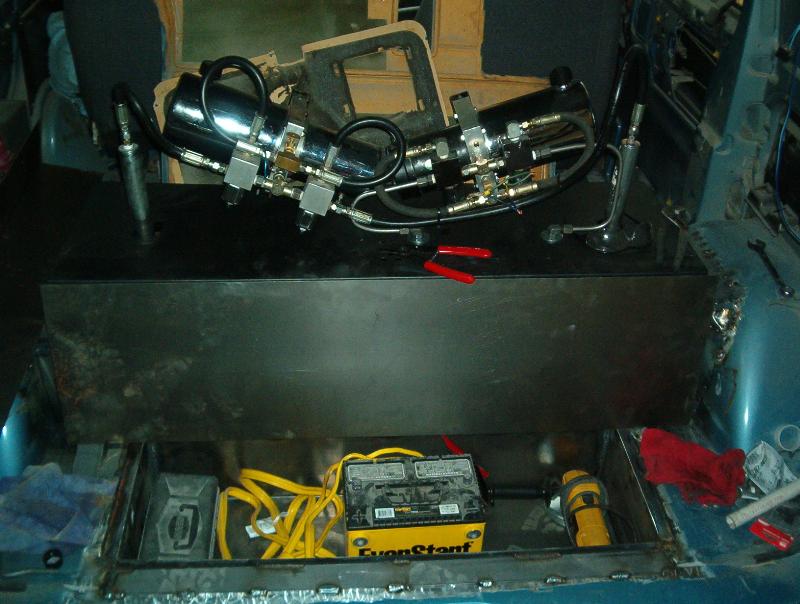4 Blazer bucket seats ( Back with red stripes) ,rear floor cut out and dropped 8" for 4 battery's, , pumps mounted on top of the bridge notch. black alligator(fake)on lower doors and the head liner and rear side panels, rest of interior painted satin black, new black carpet, and stuff...