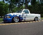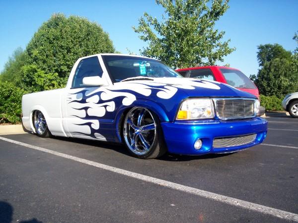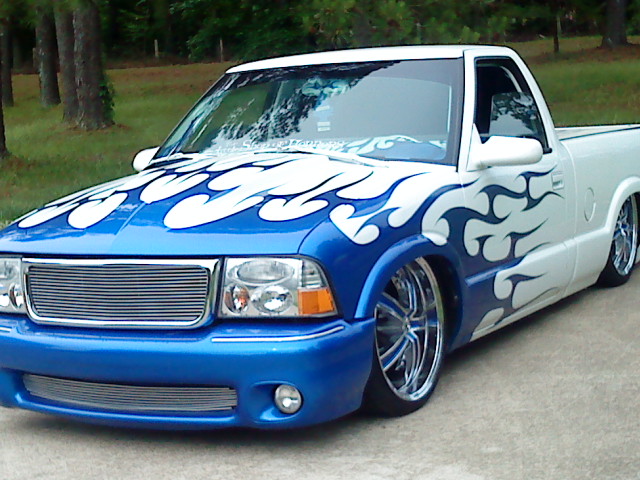 WHITE WITH BLUE GOTHIC TRIBAL FLAMES STRIPPED IN SILVER WITH PURPLE PEARL GHOST FLAMES INSIDE THE FLAMES. SHAVED ANT. TAILGATE HANDLE MOLDED IN ROLLPAN WITH ANGLED TAG, GMC ENVOY FRONT END, BILLET GRILLES, COWL HOOD, PAINTED WIPER ARMS, EURO TAILIGHTS, BED COVER, TINTED WINDOWS WITH FLAMES IN WINDOW TINT