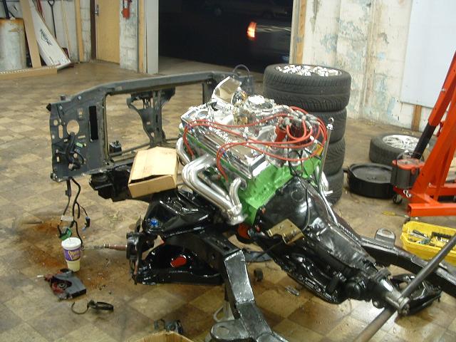 350 Turbo 350 trans. Msd ignition, MSD pro billet distributor, MSD wires, Edelbrock 500 Cfm carb, Edelbrock intake, Sanderson ceramic coated headers, chrome alternator, bunch of chrome brackets.
