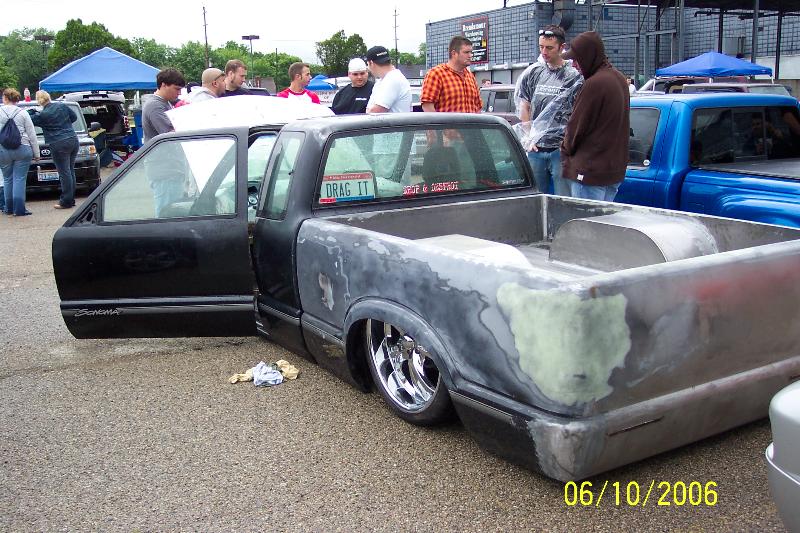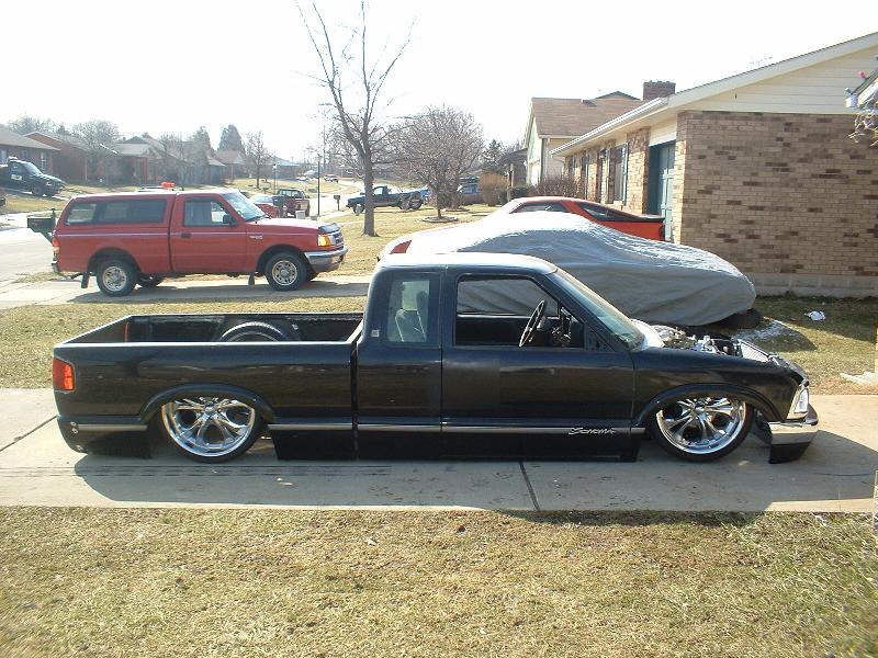 Sheet metal bed walls with the stock bed floor. Billet gas door frenched in the bed floor. Hand made tail light fillers from 16 gauge. Suicide doors, 10 inch LEDs.. Painted Viper black with Subaru blue ridge pearl flames. (pics soon)