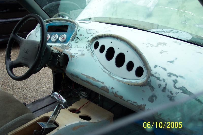 I built a custom dash that will be painted blue ridge pearl to match exterior. Acura Integra seats that will be wrapped in silver and grey suede with blue stitching. Custom built center console. Custom built speaker enclosure.