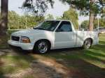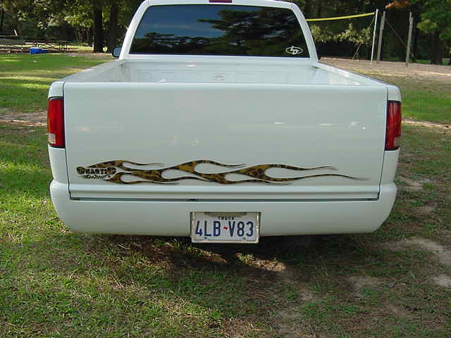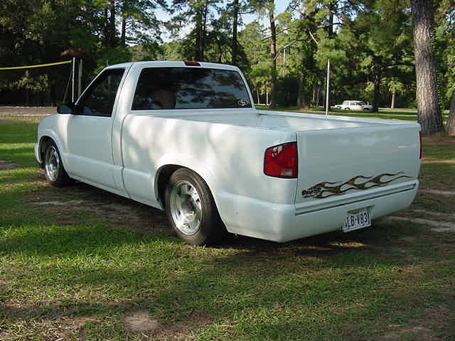 olymic white, fully shaved (except for 3rd brake light and tails) relocated antenna 5"x6" drop, gmc jimmy headlights, Tailgated has graphics on it by Max Maxwell from Chotic Customs, in Tomball,Tx....