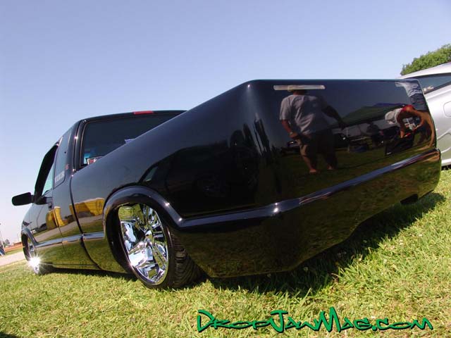 3 1/2" traditional body drop, everything shaved (except antenna), LEDs, sheet metal tubs in bed, custom 5 inch cowl hood, billet grille, aluminum fuel cell mounted in the bed
