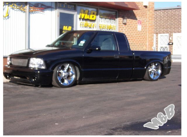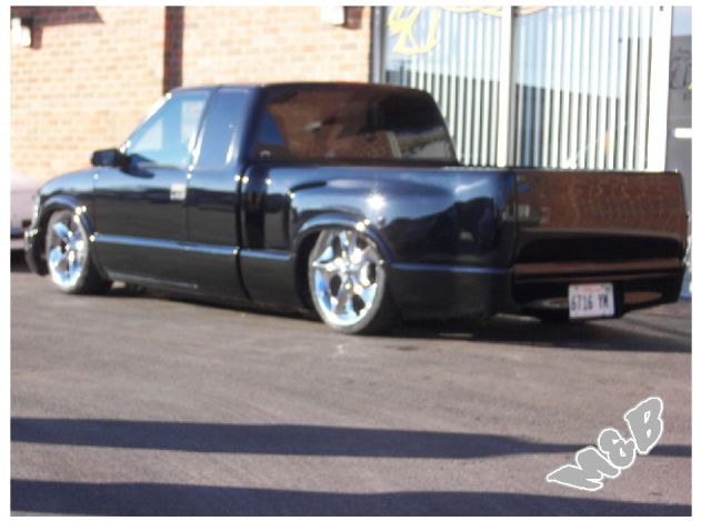 Got 8-1/2 SMCs, 1/2in line, RS72 Slam Bags front and rear, Custom painted 12gal tank with PROBLEM CHILD on it, 2-Viair 450s on custom tank mount, 175psi switch, Pete and Jakes 4 link, SD bridge, SD gas tank and carrier cearing X member, custom upper and lower shock mounts in rear, handmade Spade relay box, and a 10 switchbox.