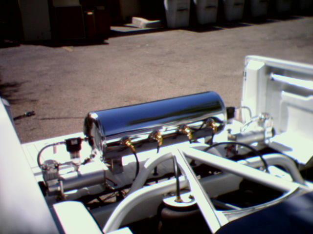 Fast Bagged, 4-Link, 2" Belltech spindels, 8 Parker valves, 2 Viaire 450c 100% duty, All 1/2 inch Lines and fittings, 9 Gallon chrome tank w/water traps, Full custom white frame from cab back, Monster C-notch,4 switch Front,Back,side to side.