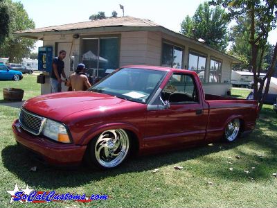 Front and rear air suspesion, 3/8 valves and line on Slam Specialty bags. New control arms and nothced out up front to lay a 20. The rear is set up on Settin' Trendz wishbone link and a huge notch to tuck a 22.
