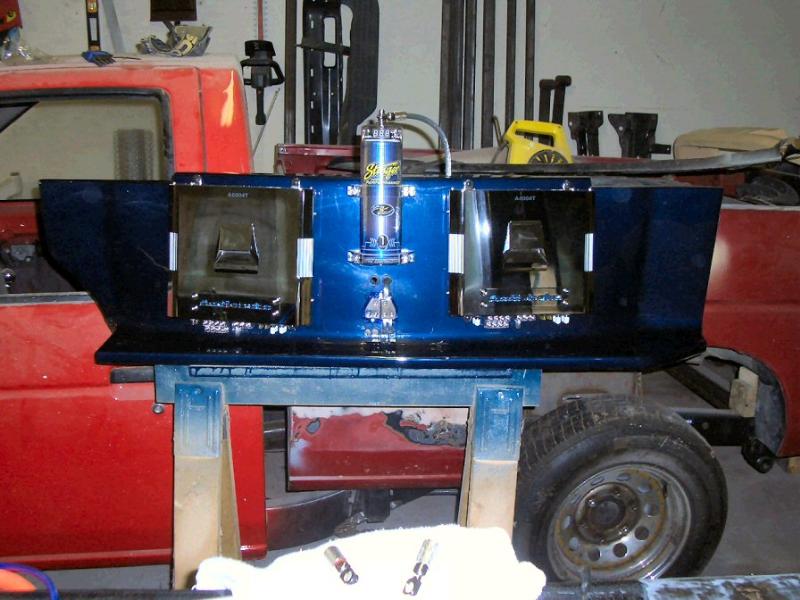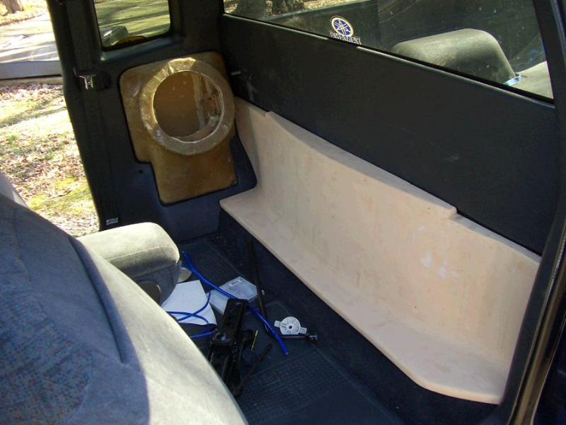 Pioneer DEH-7600MP, Audiobahn A4004T and A6004T amps, Audiobahn 4x6 plates in dash, Audiobahn 6.5 3way coax in doors, Audiobahn Flame-Q 10" sub in custom enclosure in place of jump seat, 1 Farad Stinger cap, all stinger wiring.