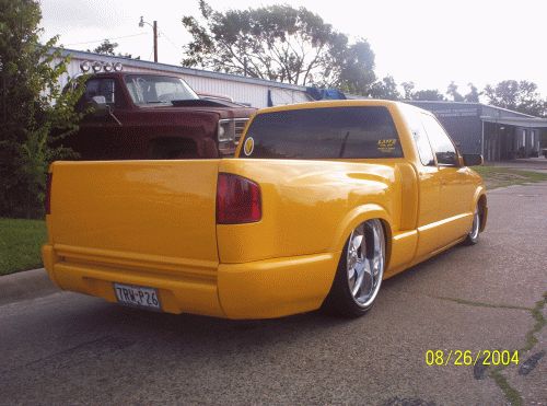 shaved brake light,tailgate handle,antena,hood squirters,and cut 3" off rear steps with a roll pan,billet grill,candy taillights,trenz billet license plate w/no bolt holes,trenz billet wiper covers