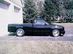 Lowered 4" front (Bell Tech 2" spindles and 2" springs), slightly modified lower control arms, 5" rear (3" Posies monoleaf springs, 2" Bell Tech blocks), one of the first 10 sets of the Bell Tech "Nitro Drop" shocks were made for this truck - done the RIGHT WAY!