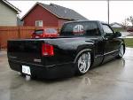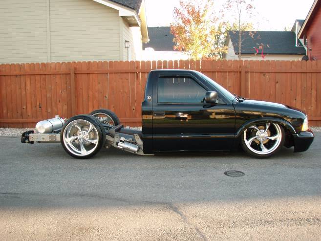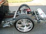 Baer rear disc's, Braided brake line's, 5-link Set-Up, Narrowed stock frame 5 1/2 inches, (8) 1/2 parker valves, (2) silver Air Zeniths,(2) 5 gallon SD tanks powdercoated titanium, Narrowed rearend powdercoated titanium, Shaved & smoothed frame rails,1/2 air line, 1/2 dump control valves, PTC fittings, Conti 2600's Back, Slams Up Front.