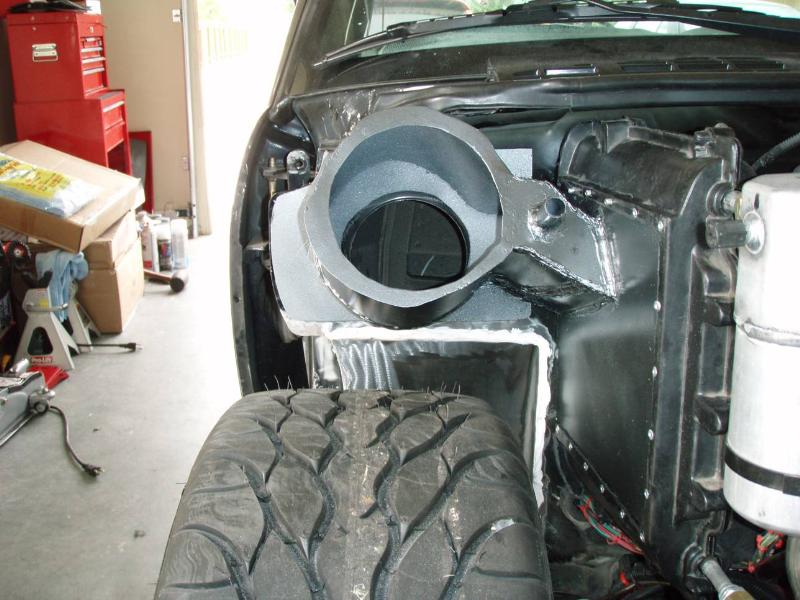 Blower Housing built at a 33 degree angle to tuck wheels. Uses the complete stock firewall A/c hole, so I don't lose any A/C pressure