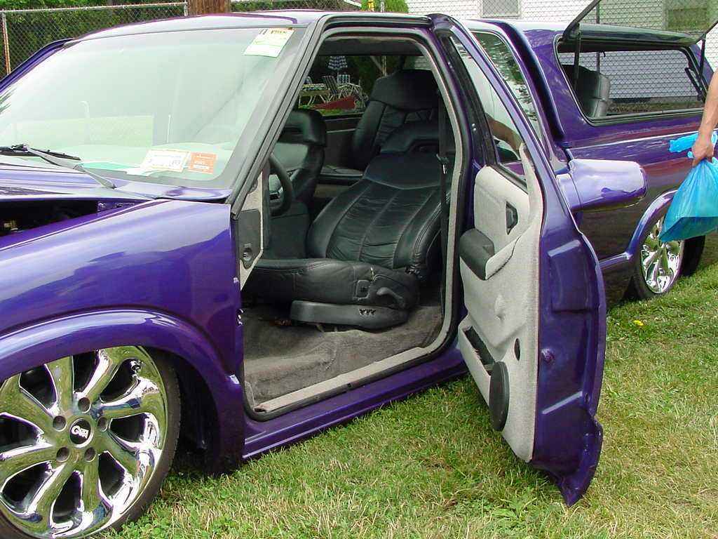 3 & 3/4 Inch Body Drop, 2000 gmc envoy front end, Shaved Firewall, Notched Firewall To Fit The 17'S, Factory Purple Paint, Sunroof, Billet Grille Insert, Leer Cap, Full Walk Through, Sir Michaels Smooth Roll Pan, Shave Tailgate With Frenched In License Plate Box, Shaved Tailights, Shaved Suicide Doors, Shaved Antenna, Flush Led Tailights , Ram Air Hood
